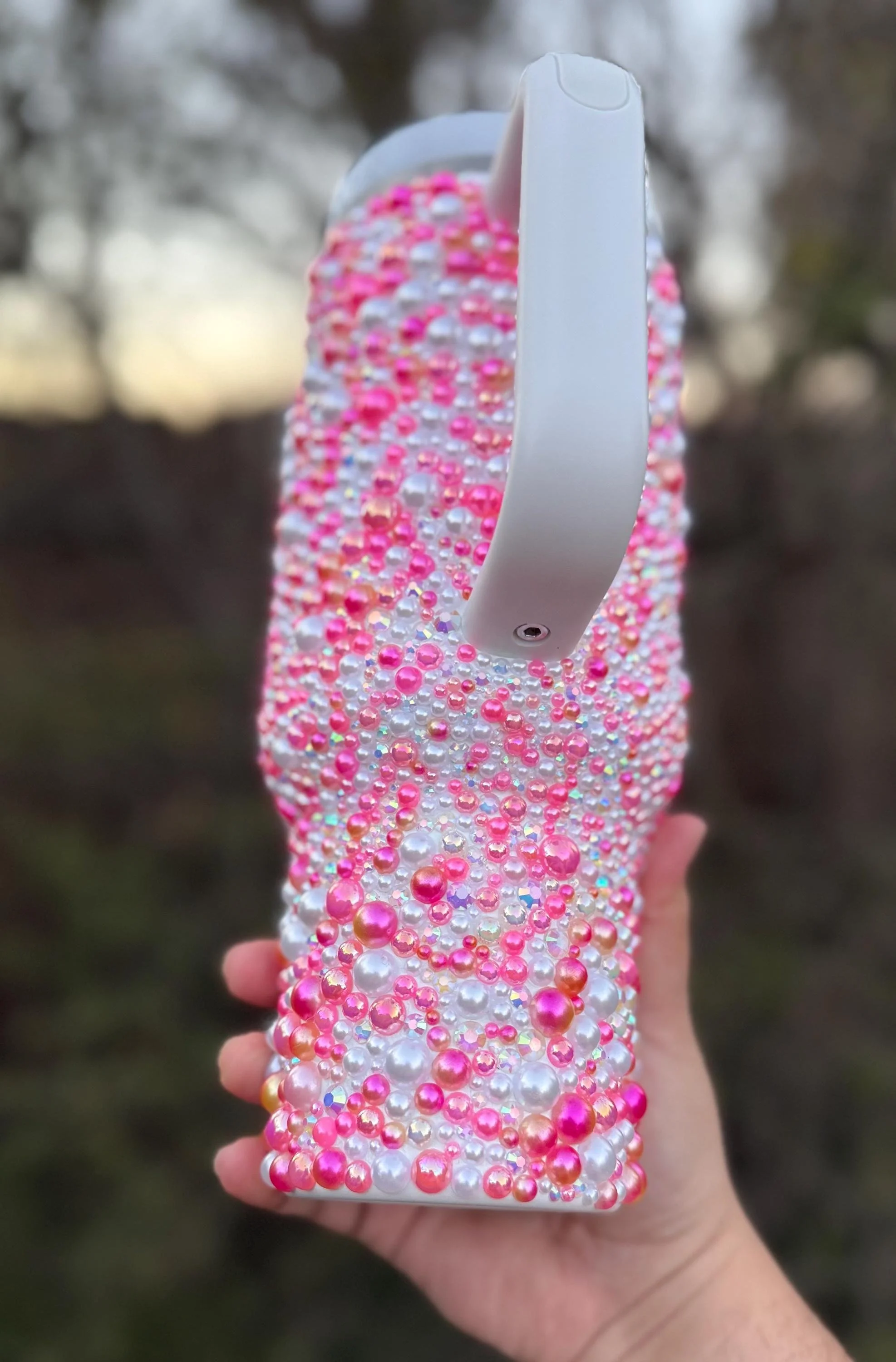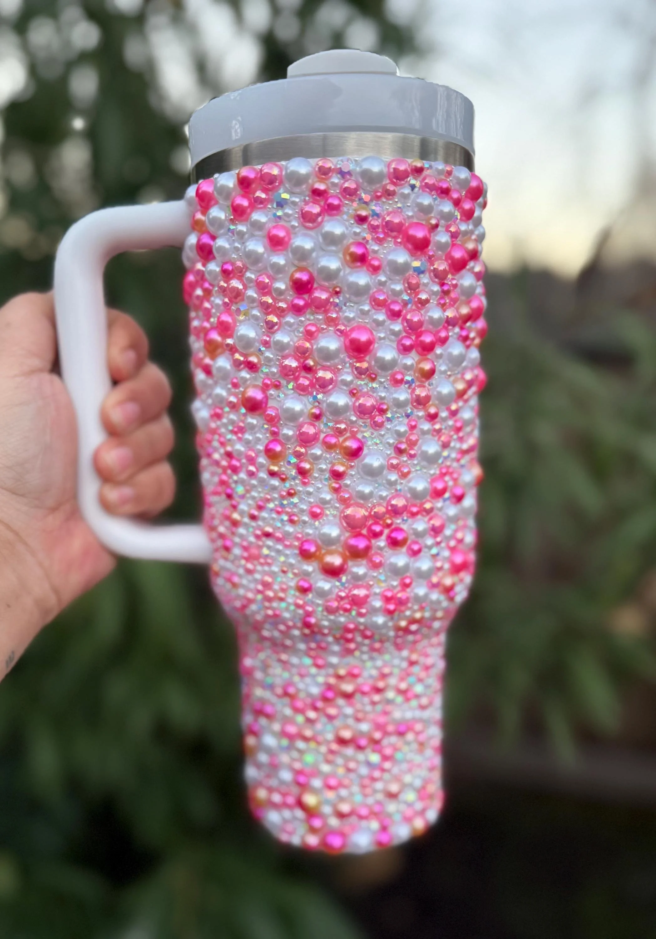 - Includes 1 Stanley 40oz cup in Seafoam, decorated with hand placed mix of pink and white pearls